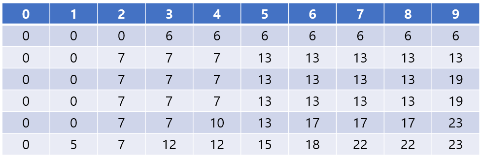 즉, s[i][j] = max(s[i - 1][j], s[i][j - w] + v)이며, 이와 같은 방법으로 배열을 다 채우면 다음과 같이 될 것이다.