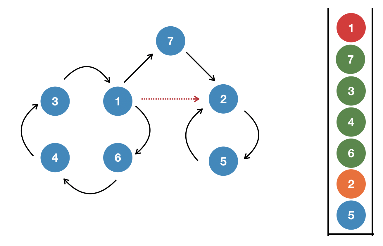 4. 정점을 추가한 그래프에서 코사라주 알고리즘을 수행하면 오른쪽과 같이 스택에 데이터가 쌓일 것이다. 주목할 것은 1번 정정과 2번 정점 사이의 간선이다. 1에서 2로는 7을 거쳐서 갈 수 있기 때문에 1과 2를 연결하는 간선은 없애야한다.