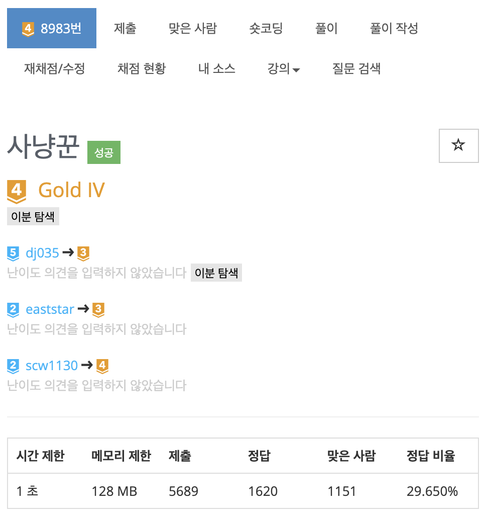 1. n마리의 동물을 주어지는 순서대로 잡을 수 있는지 여부를 검사하자. 사대를 정렬한 뒤 이분 탐색으로 시간 복잡도를 낮추도록 하자.