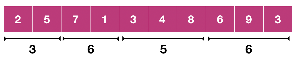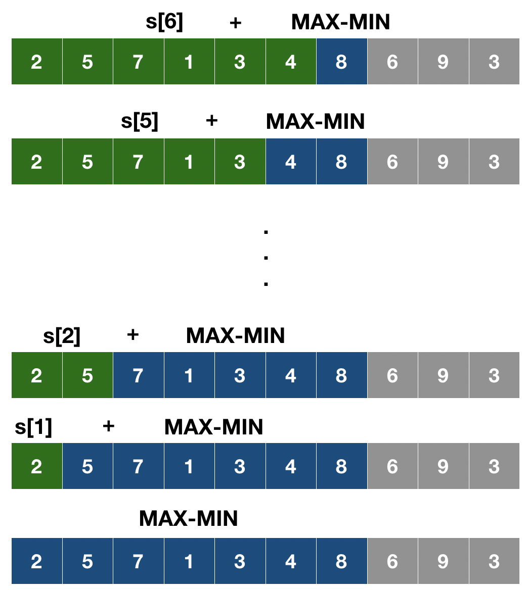 2. s[i]를 i명으로 조를 짤 때의 조가 잘 짜여진 정도의 최댓값이라고 하자. 예를 들어, s[7]을 구하는 과정을 보자. 초록색 부분은 이전에 구한 값을 이용하고, 파란 부분에 있는 원소들의 최대값과 최솟값을 구해 그 차이를 초록색 부분과 더한다. s[7]은 이러한 방식으로 만들어진 아래 값들 중 최대값을 취하면 된다.