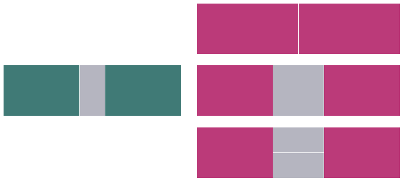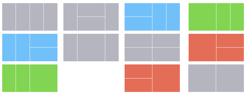 2. 타일의 모양을 살펴보면, 좌우 대칭(색칠된 타일)인 타일과 좌우가 같은 타일 두가지 경우로 나타난다. 좌우가 같은 타일은 아래 그림과 같은 타일들이다. 이와 같이 좌우 대칭인 타일을 X, 좌우가 같은 타일을 Y라고 할 때, 총 2X+Y개의 타일이 만들어 진다. 문제에서 좌우 대칭인 타일을 하나의 경우로 처리하는 것이므로 좌우 대칭인 타일을 없애야 한다. 하지만 그러한 타일을 찾기는 어렵다...(누군가에겐 쉬울지도) 좌우가 같은 타일 Y를 2X+Y에 더해서 2로 나누는 방법으로 X+Y를 구한다.