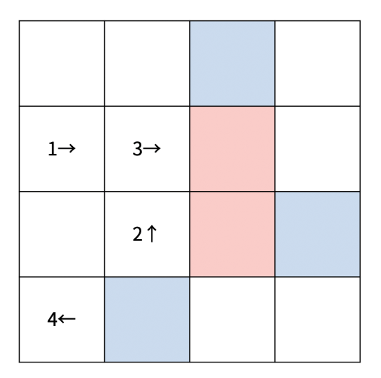 (해당 상태는 말의 이동을 처리하는 함수에서 설정하자.) - 그리고 이동하려는 위치를 검사해야 한다. 만약 체스판의 범위를 벗어나거나, 칸이 파란색이라면 진행 방향을 반대로 하여 이동하게 된다.