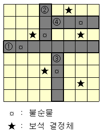 3. 더 잘라봐야 하는 경우에는 자를 수 있는지를 봐야한다. 우선, 자르고자 하는 방향에 맞게 모든 행이나 열을 경계선으로 삼는다. (가로로 자를 때는 하나의 행을, 세로로 자를 때는 하나의 열을...) 이때, 단 한가지 조건을 만족해야지 경계선을 경계삼아 석판을 자를 수 있는데, 바로 그 조건은 경계선에 1개 이상의 불순물만 있어야 한다는 것이다. 즉, 불순물이 하나도 없거나, 보석 결정체가 하나라도 있으면 경계선으로 삼아 자를 수 없다.