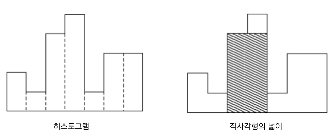 왼쪽과 그림과 같은 히스토그램에서 오른쪽 그림과 같은 직사각형 넓이의 최대값을 구한다.