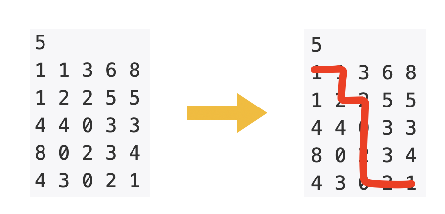아래와 같은 nxn 배열의 (0,0) 부터 (n-1,n-1)까지 이동하기 위해 거쳐간 수들의 최대값과 최소값의 차이를 가장 작게 만드는 경우를 찾자.