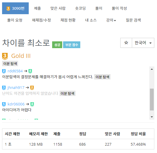 1. 0부터 10^9까지의 범위에서 이분탐색으로 인접한 수의 차이 값의 상한을 구해나간다.