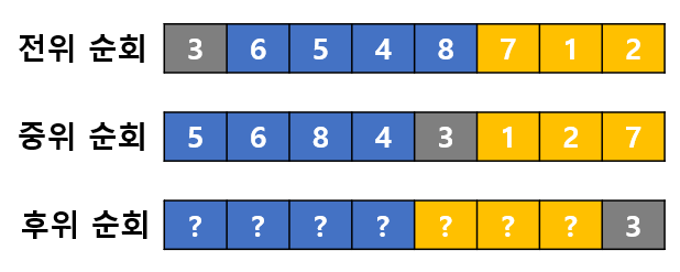 - 세번째 후위 순위의 그림을 보면, 나머지는 어떤 수인지 몰라도, 파란 부분의 노드들과 노란 부분의 노드들 순으로 나온뒤에, 루트 노드가 맨 마지막으로 나온다는 것을 알 수있다.