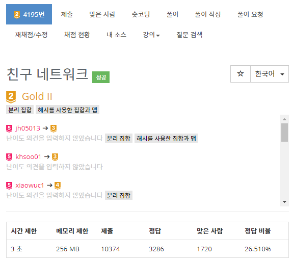 1. 분리집합 자료구조로 친구 관계를 나타내보자. disjoint-set을 구현해 봤다면 어렵지 않은 문제이다.
